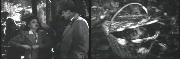 He gets closer and begins to talk to Marie . . . and the little dog Pard peeks out from the basket . . .