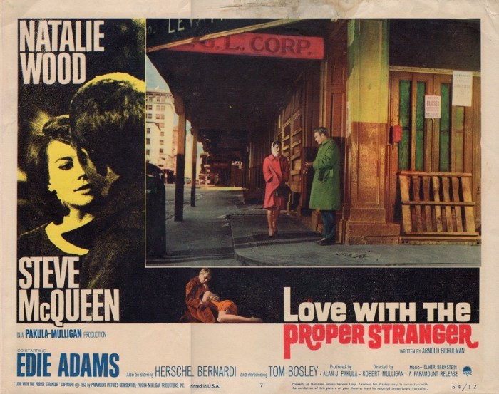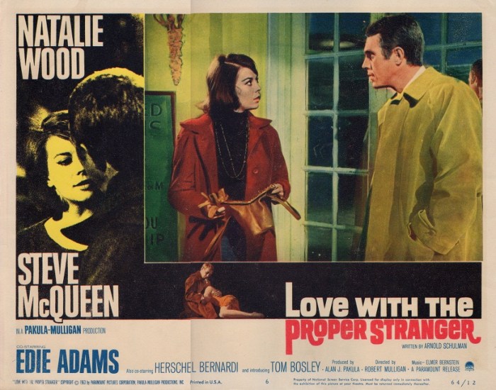 A Best Actress Oscar nomination for 1961’s “Splendor in the Grass” and lead role in “West Side Story” the same year, nominated for 11 Oscars and winning ten — including both supporting actors. Has any film actress had a better year? Or a more disappointing one? At the same time? No matter. She will soon garner a third nomination for the role she is about to play, in the film she has come to New York to make, “Love with the Proper Stranger.” She is Angie Rossini, a young, vivacious but already world-weary Italian-American girl who is smothered by her family and pregnant by Steve McQueen’s Rocky Papasano, an irresponsible douche-bag musician, after what was to him (but not her), a routine, drunken one night stand.