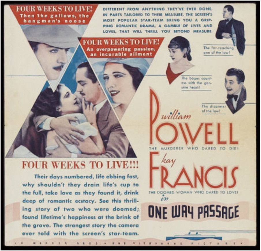 But the Brothers Warner would extract a measure of satisfaction from their next pairing of Kay Francis and William Powell, another “classic of its kind,” a film they released only three months after the premier of Jewel Robbery in New York, the milestone mini-melodrama/soap operetta without song, One Way Passage.